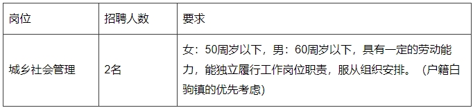 根據(jù)工作需要,白駒鎮(zhèn)人民政府現(xiàn)面向社會公開招聘2名公益性崗位人員。現(xiàn)將招聘崗位公告如下: