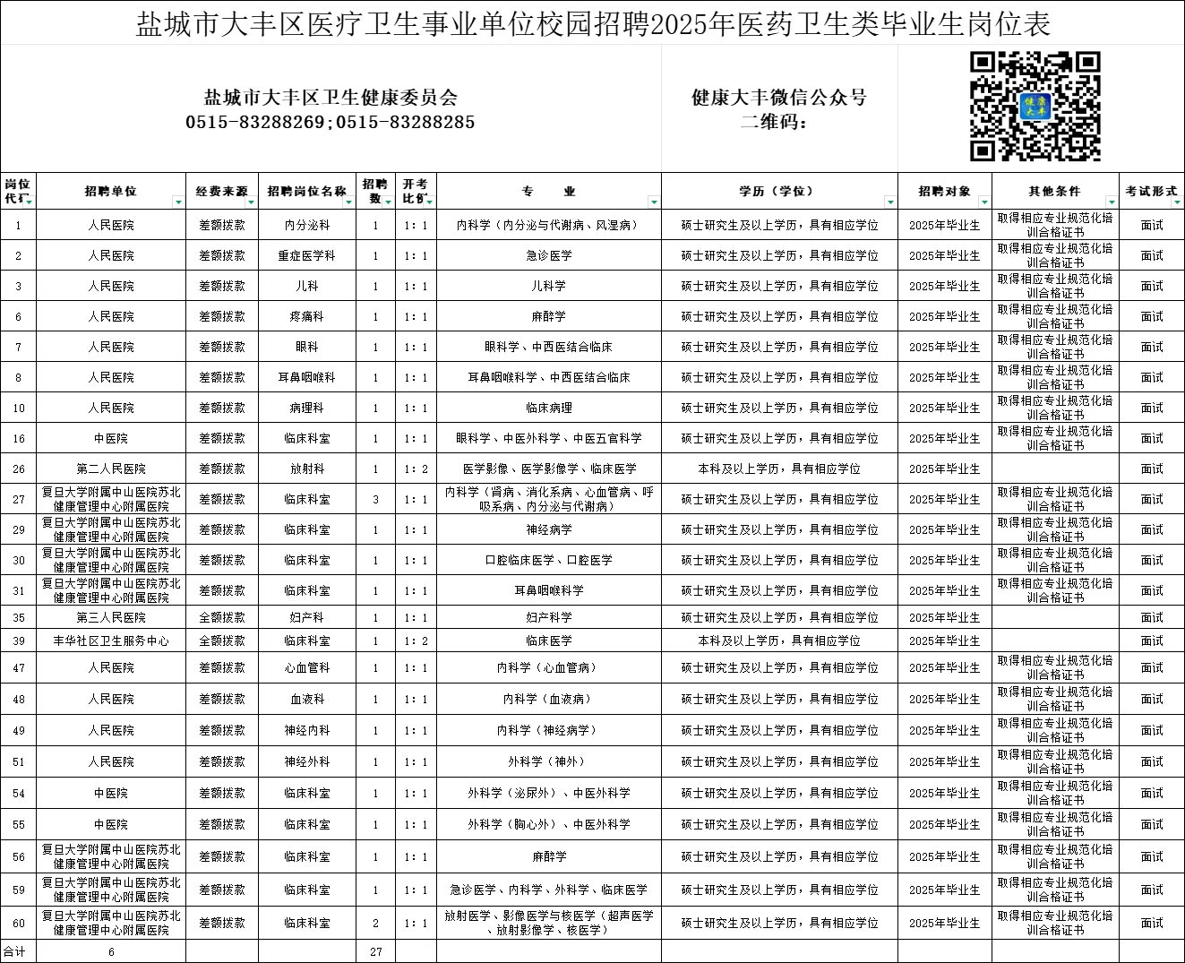 崗位、專業、人數及其他條件詳見《鹽城市大豐區醫療衛生事業單位校園招聘2025年醫藥衛生類畢業生崗位表》(附件1),以下簡稱《招聘崗位表》。