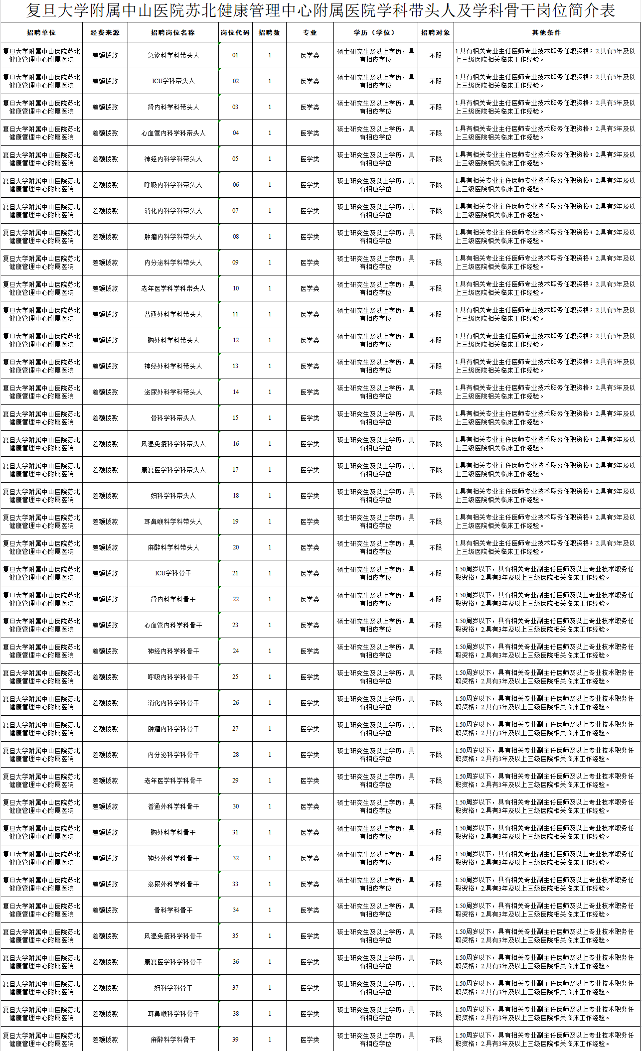 急診科、ICU、腎內科、心血管內科、神經內科、呼吸內科、消化內科、腫瘤內科、內分泌科、老年醫學科、普通外科、胸外科、神經外科、泌尿外科、骨科、風濕免疫科、康復醫學科、婦科、耳鼻喉科、麻醉科等醫學相關科室學科帶頭人20人、學科骨干19人。(具體崗位要求詳見附件1)