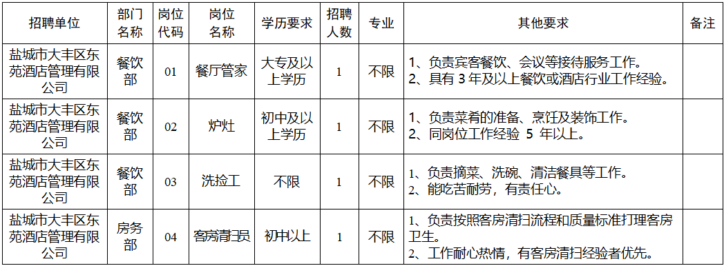 附件1:鹽城市大豐區東苑酒店管理有限公司公開招聘勞務派遣(外包)人員崗位表