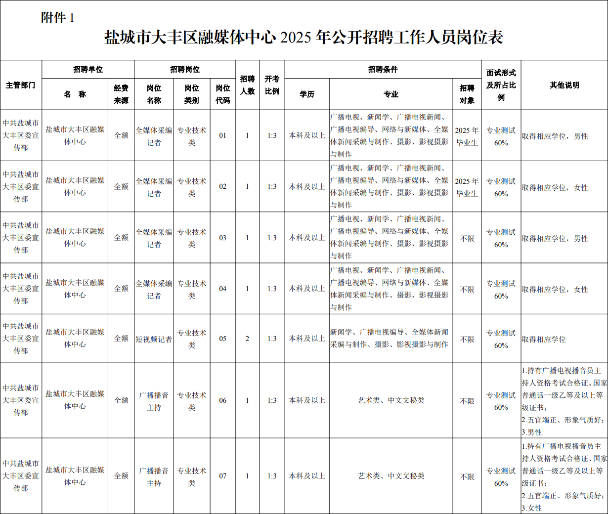 鹽城市大豐區(qū)融媒體中心2025年公開招聘工作人員崗位表