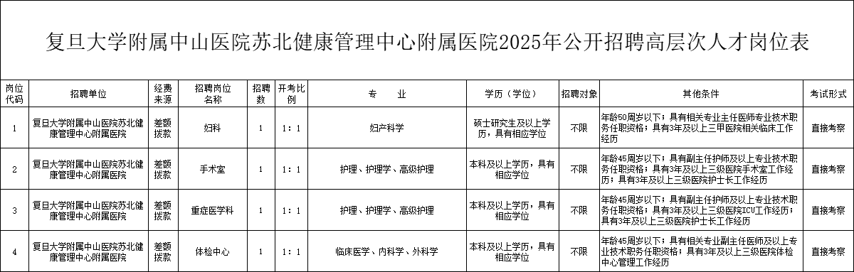 1.復旦大學附屬中山醫院蘇北健康管理中心附屬醫院2025年公開招聘高層次人才崗位表