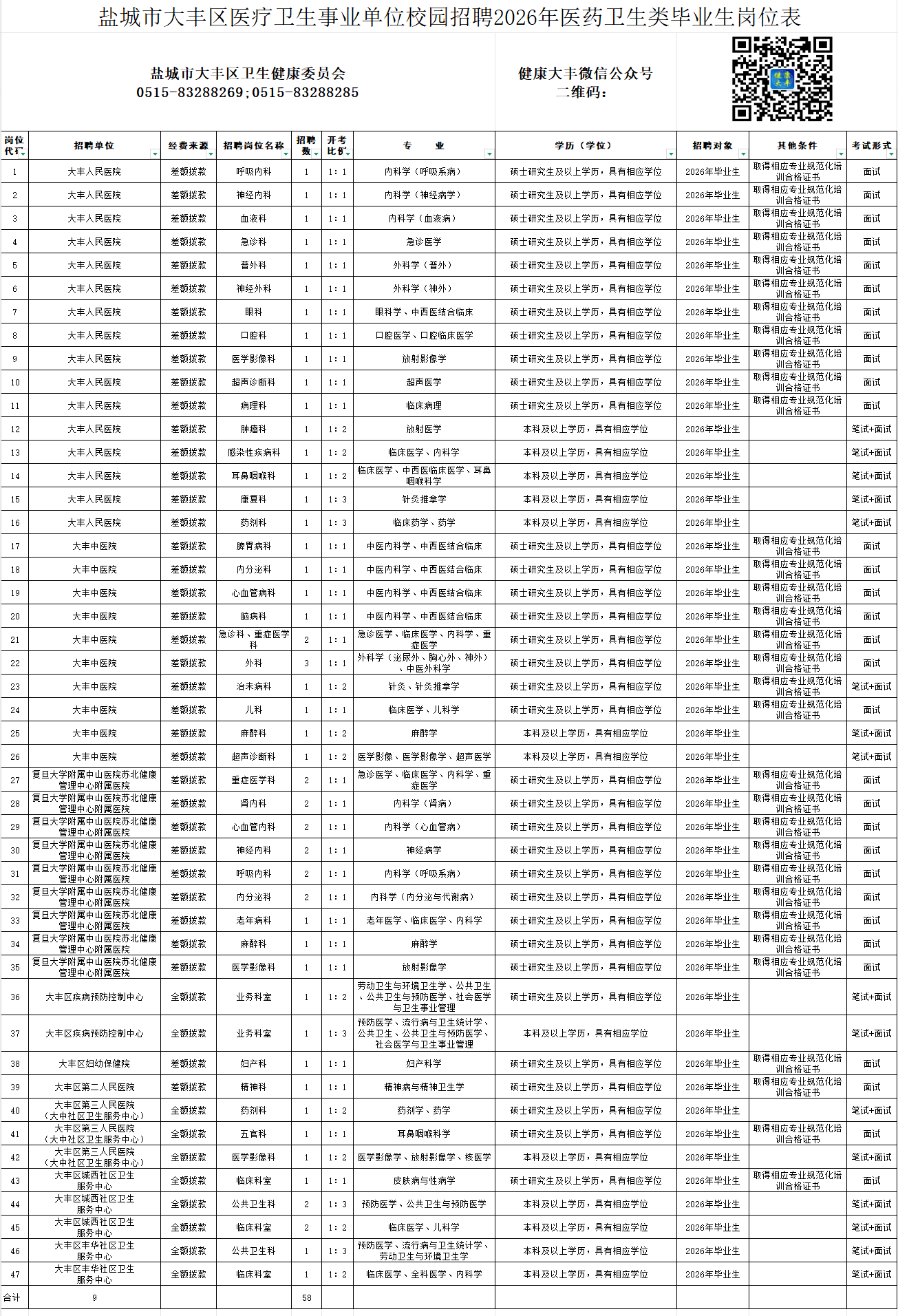 崗位、專業、人數及其他條件詳見《鹽城市大豐區醫療衛生事業單位校園招聘2026年醫藥衛生類畢業生崗位表》(附件1),以下簡稱《招聘崗位表》。