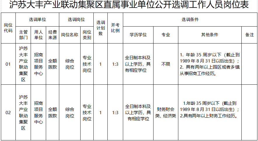 選調(diào)崗位及人數(shù)詳見(jiàn)《滬蘇大豐產(chǎn)業(yè)聯(lián)動(dòng)集聚區(qū)直屬事業(yè)單位公開(kāi)選調(diào)工作人員崗位表》(附件1)。