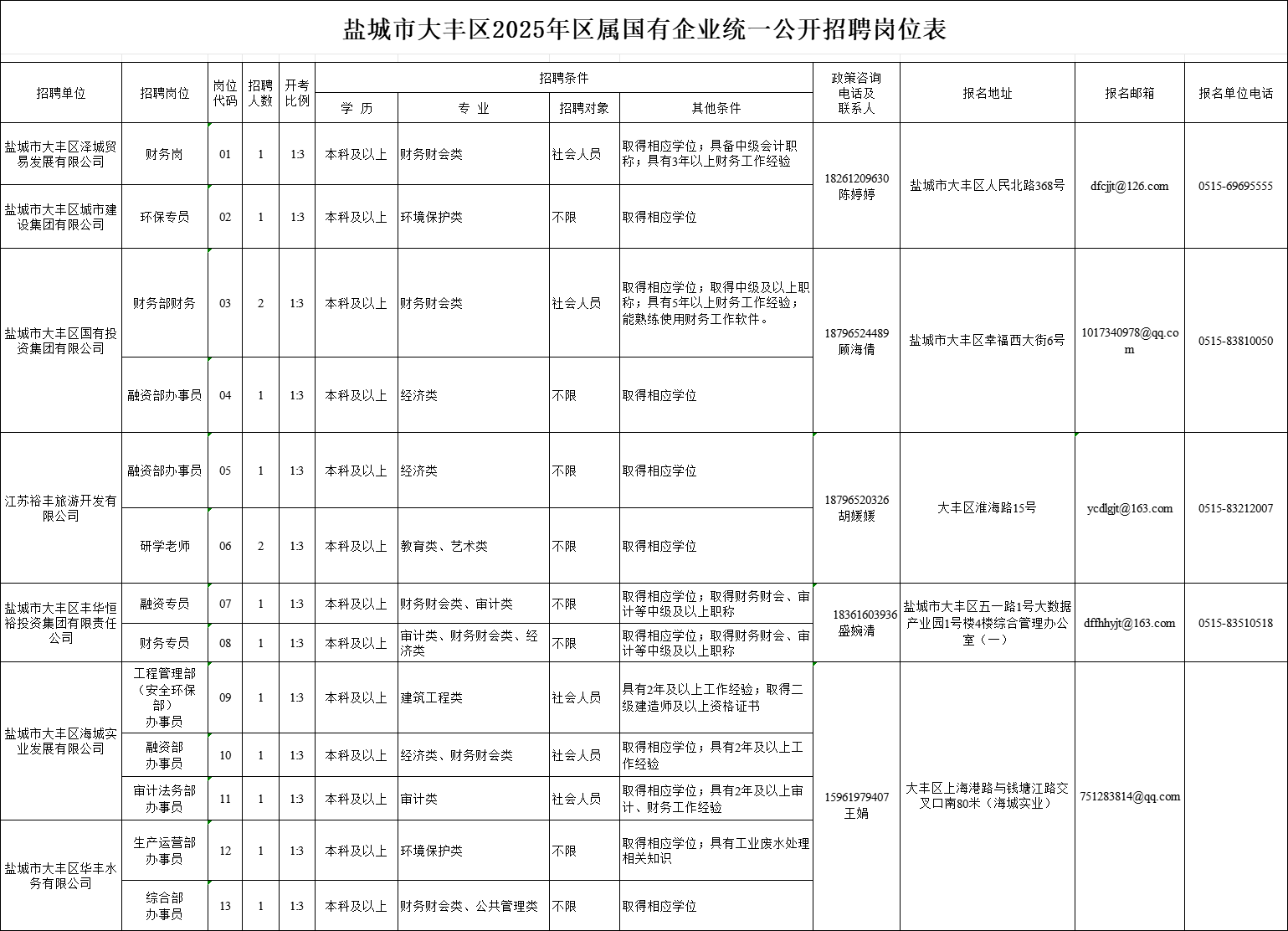大豐區(qū)2025年度區(qū)屬國有企業(yè)統(tǒng)一公開招聘崗位表