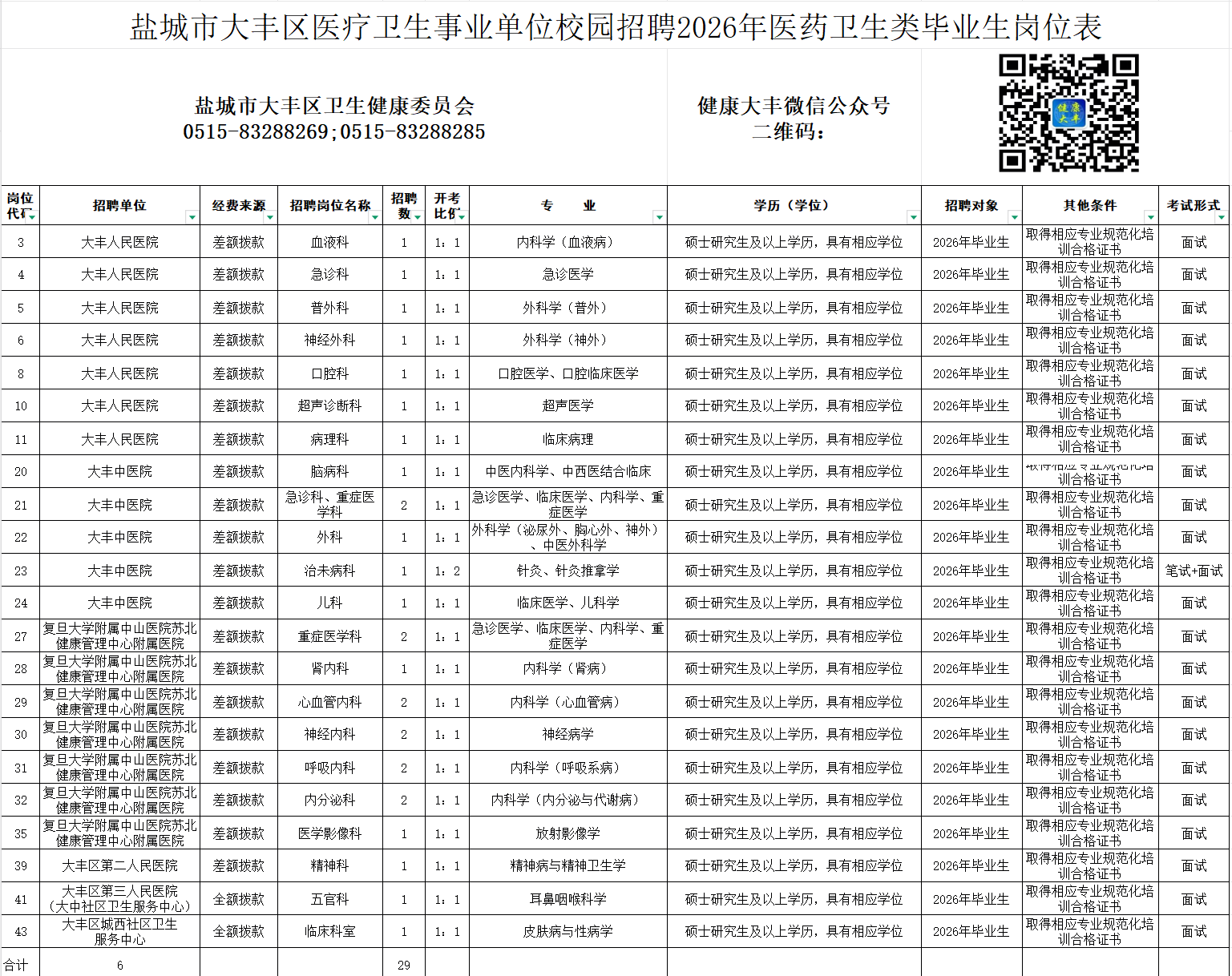 崗位、專業、人數及其他條件詳見《鹽城市大豐區醫療衛生事業單位校園招聘2026年醫藥衛生類畢業生崗位表》(附件1),以下簡稱《招聘崗位表》。