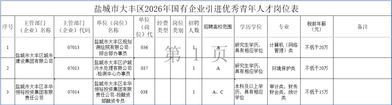 引進(jìn)單位、崗位、人數(shù)和相關(guān)要求詳見《江蘇省鹽城市2026年國有企業(yè)引進(jìn)優(yōu)秀青年人才崗位表》。